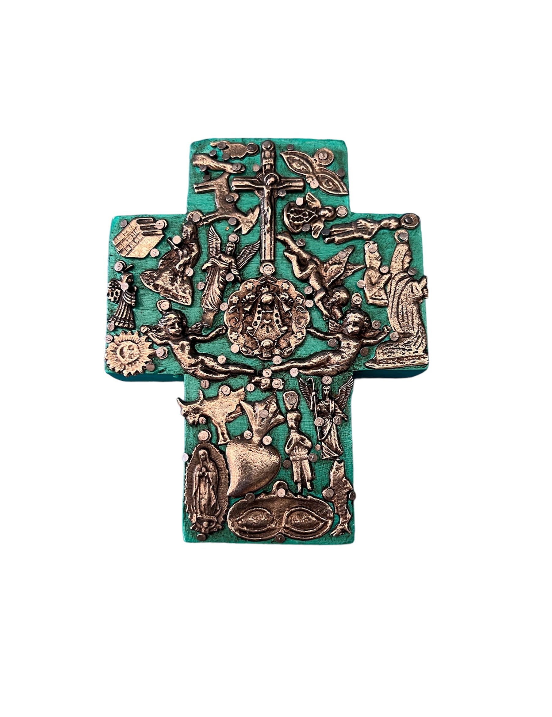 Mexican Turquoise Wooden Cross with Antique Aged Milagros