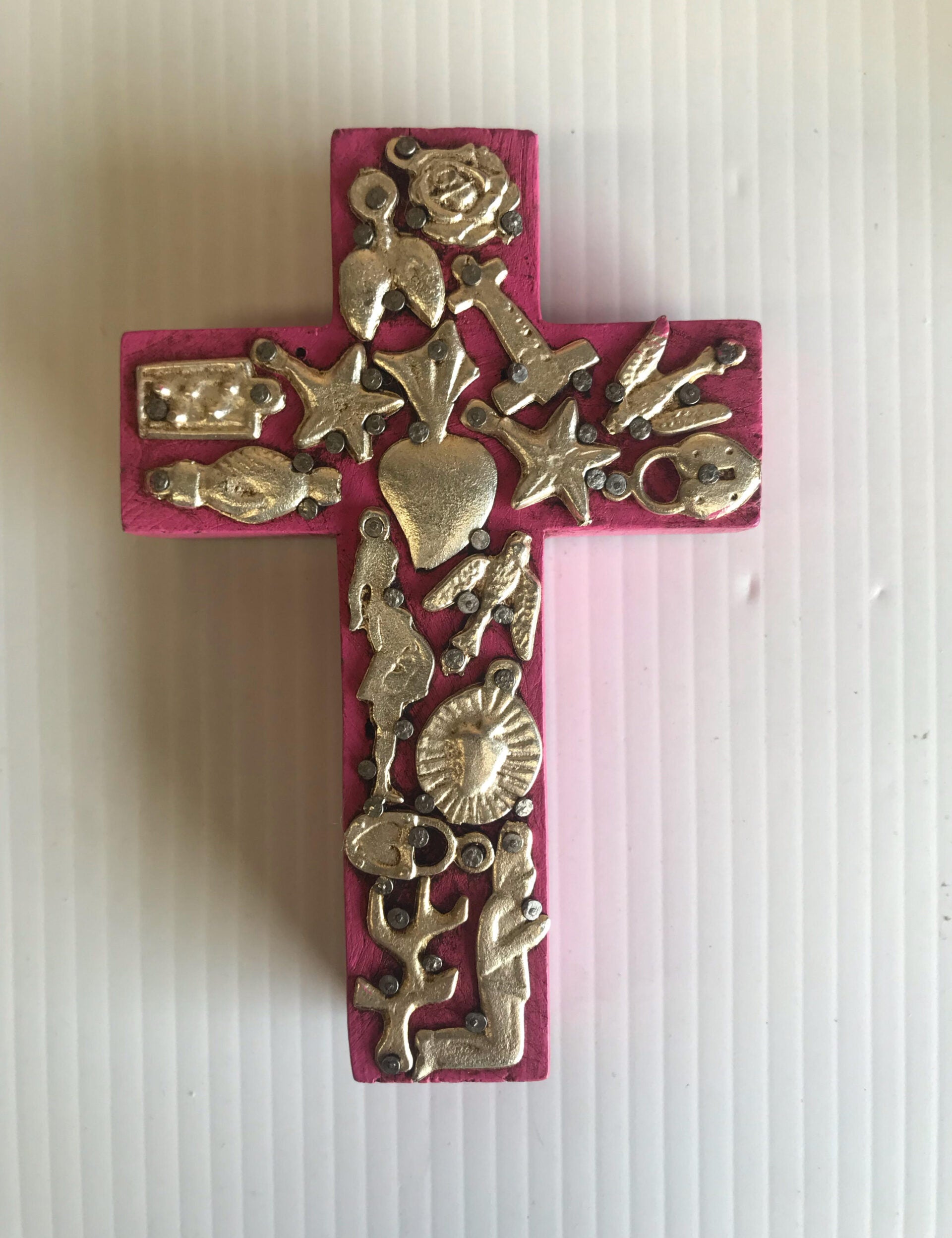 Mexican Small Pink Cross with Milagros