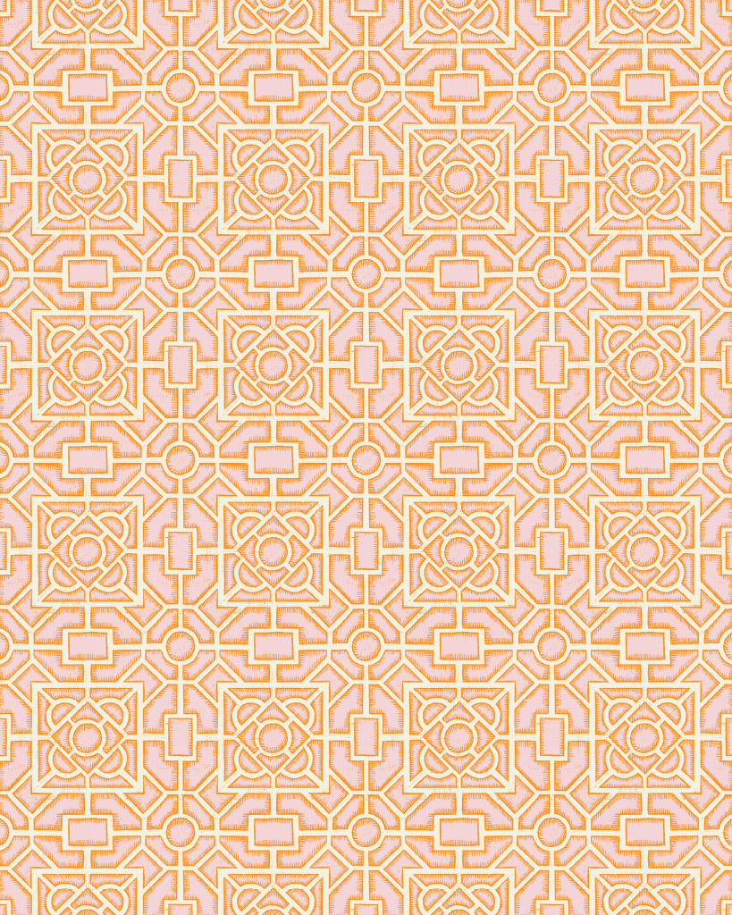 Borders is an Annie Sloan with the Royal Horticultural Society (RHS) Decoupage Paper showing a plan for a knot garden from “The orchard and the garden”. London: printed by Adam Islip 1602. This geometric design is an elaborate repeat of squares and circles, printed to match Chalk Paint™ colours Barcelona Orange and Antionette. It features hatching to create a detailed, shaded effect.