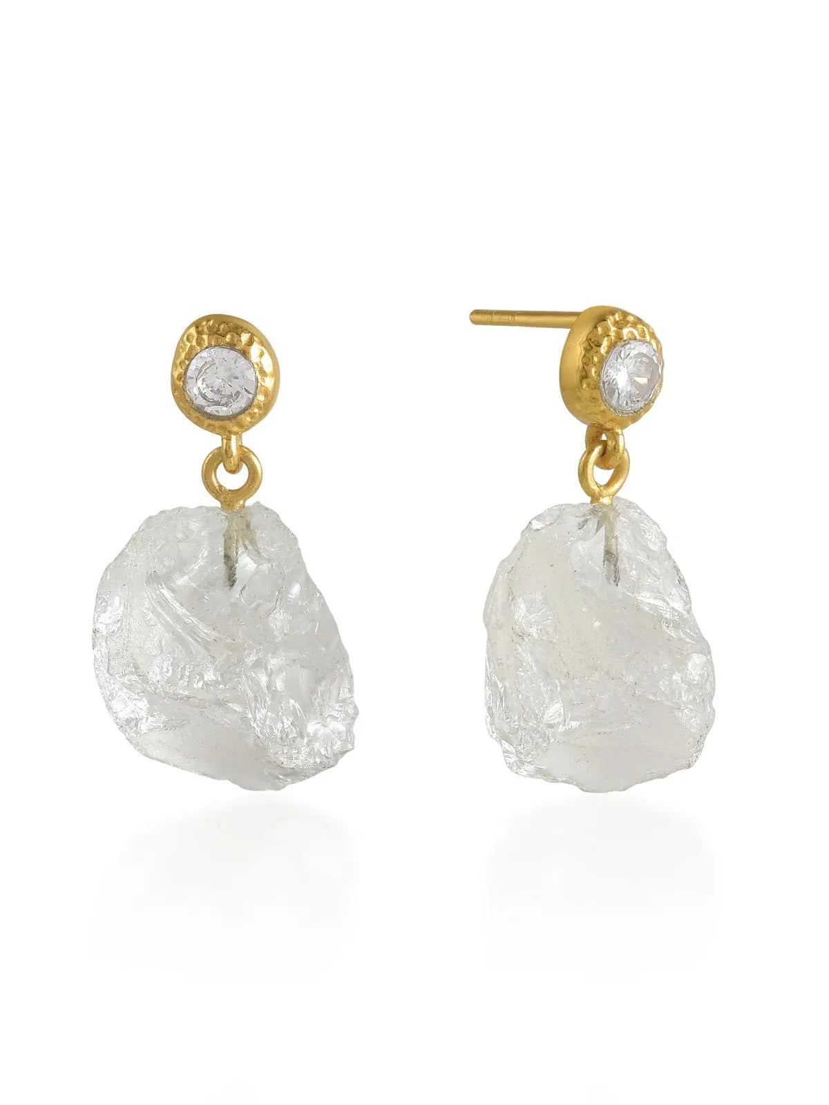The Athena Earrings are a part of the raw crystal collection. A wonderfully natural style,  this beautiful stone is in its natural shape. It has an elegant hand hammered gold top. This earrings is the perfect size, lending itself to both effortless day wear and evening wear.