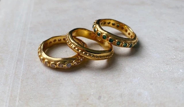 The Astri Stacking rings our are latest obsession. Handcrafted so each one is slightly unique in its shape. The Astri ring is formed of gold band with tiny crystals set throughout the band. The Astri ring comes in three colour ways, pictured here in Crystal Clear, Emerald Green and Solid. They can be worn by themselves or mixed and matched as seen here.