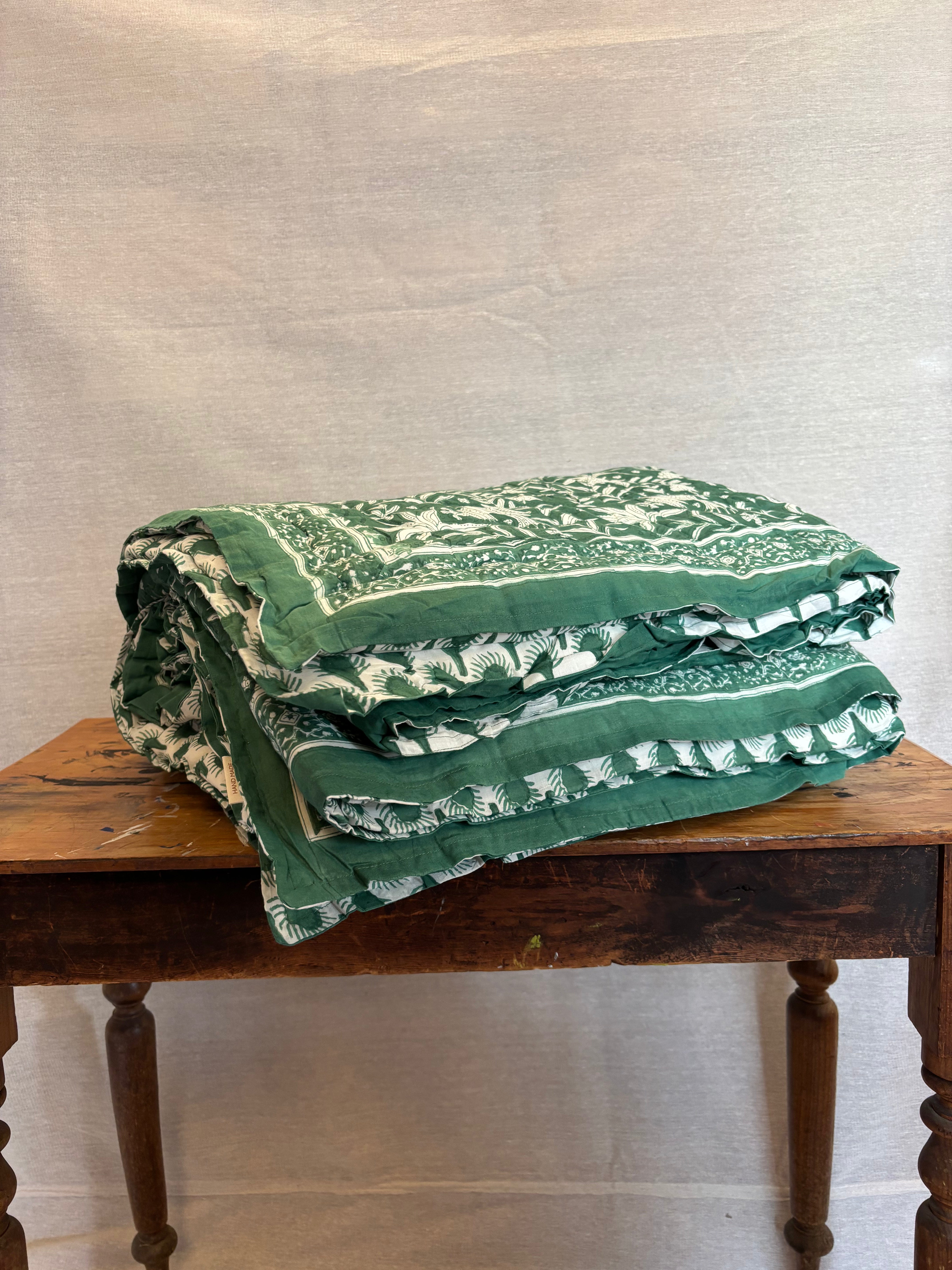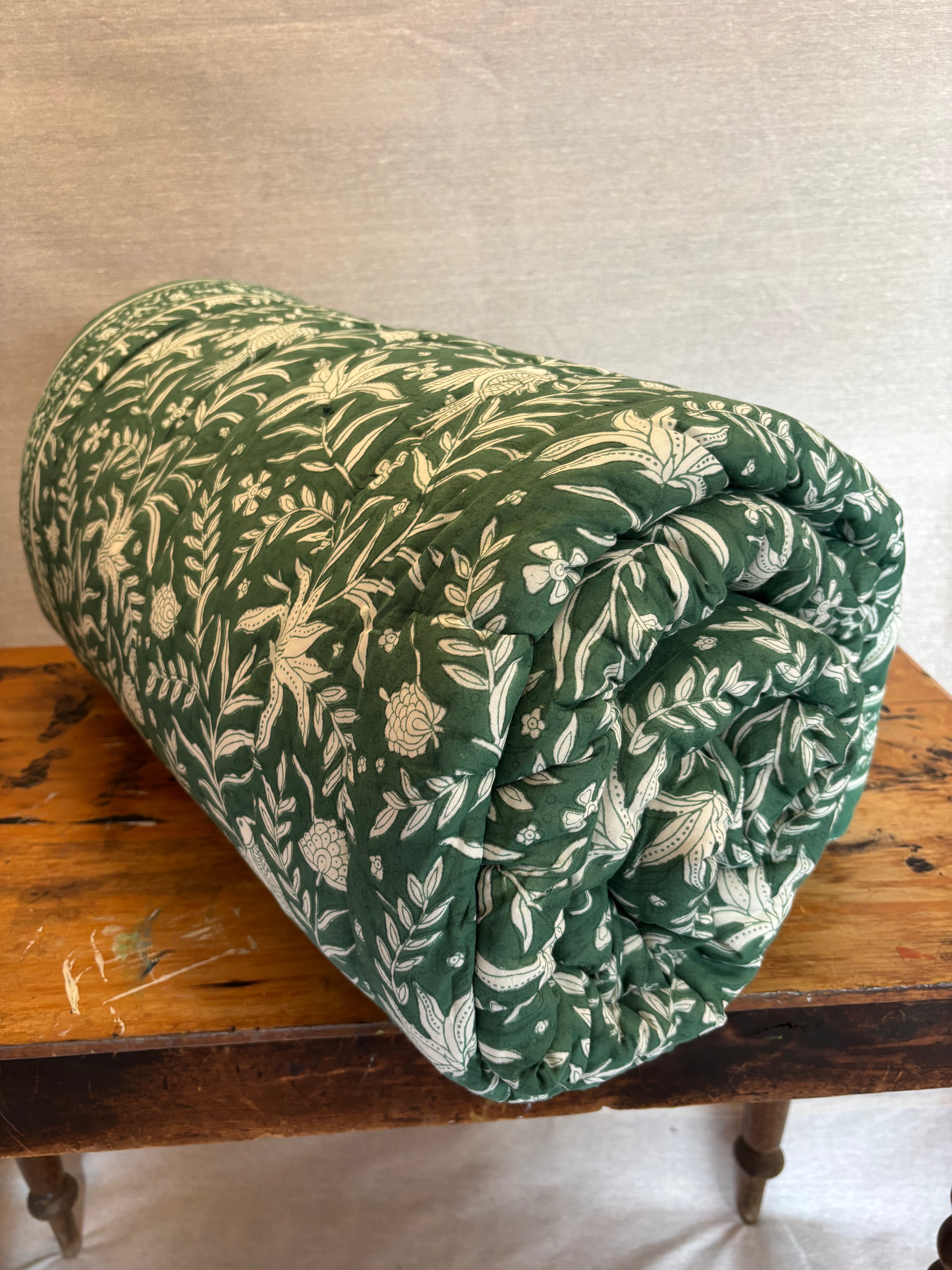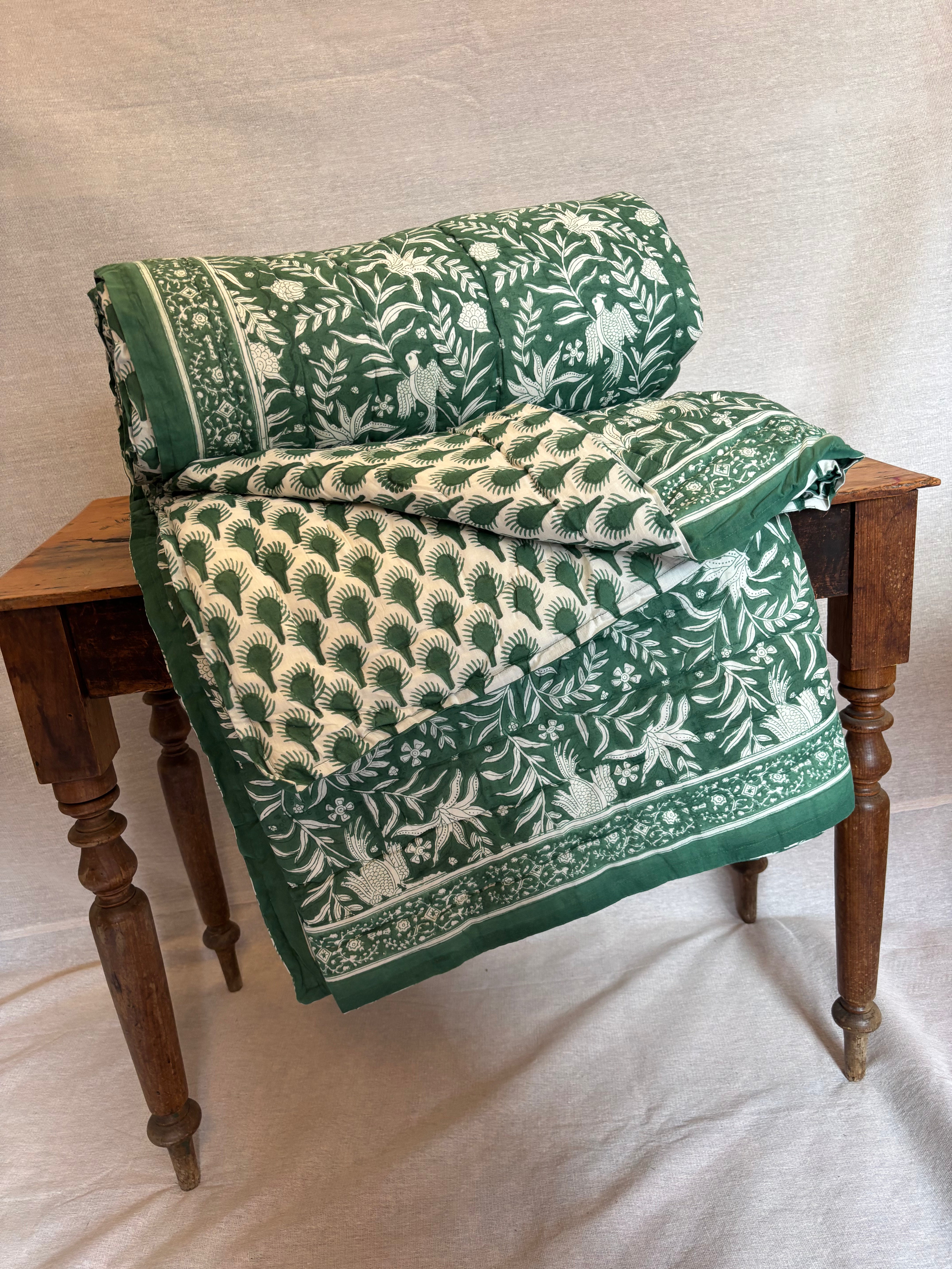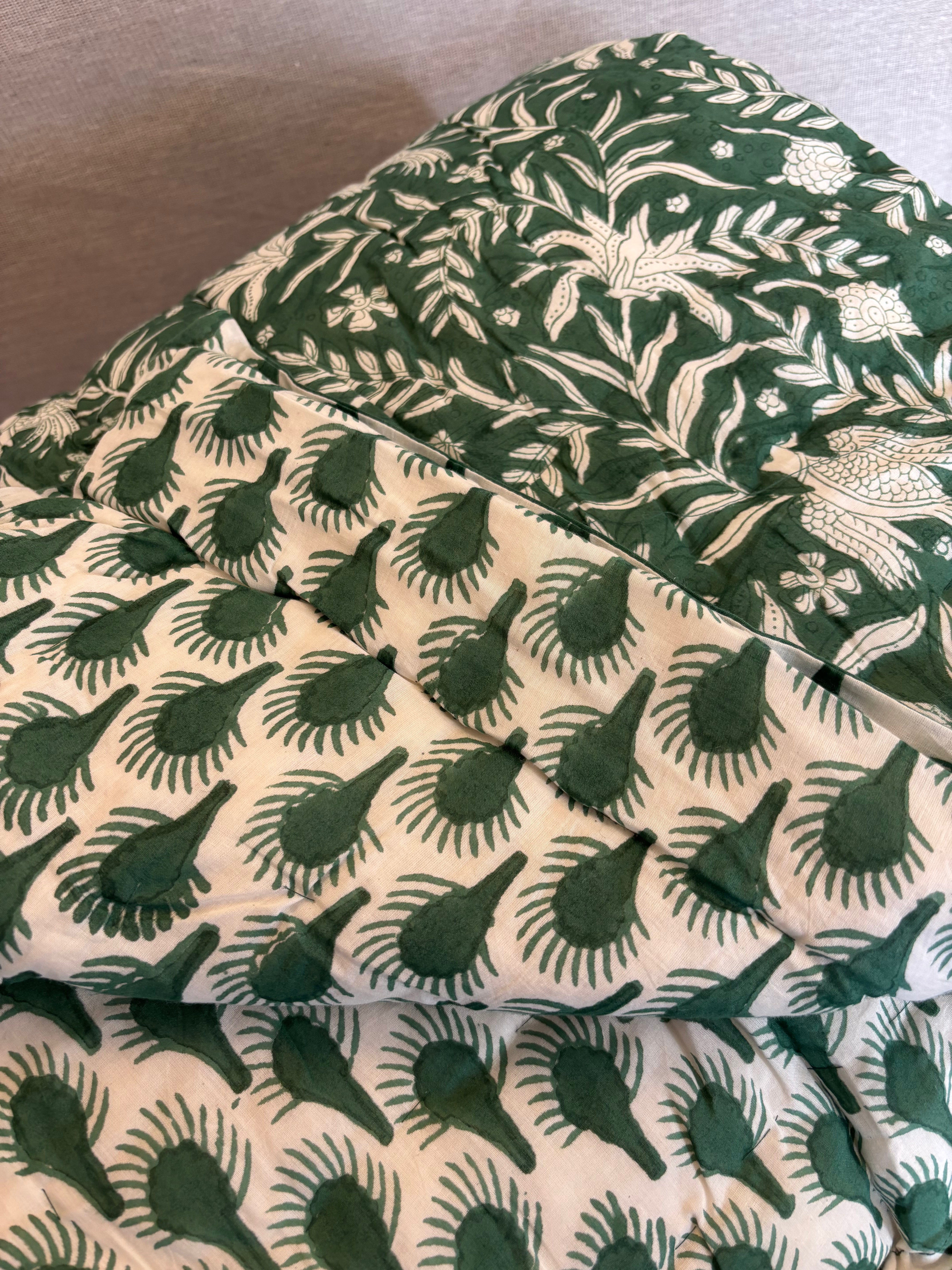 These quilts are lovingly hand block printed by skilled artisans in Jaipur, India using traditional techniques.  They are then filled with natural cotton padding and hand quilted by a skilled group of beautiful ladies in a labour of love that shines through in these beautiful heirloom quilts.  Due to their handcrafted nature, irregularities may occur rendering each piece unique.