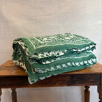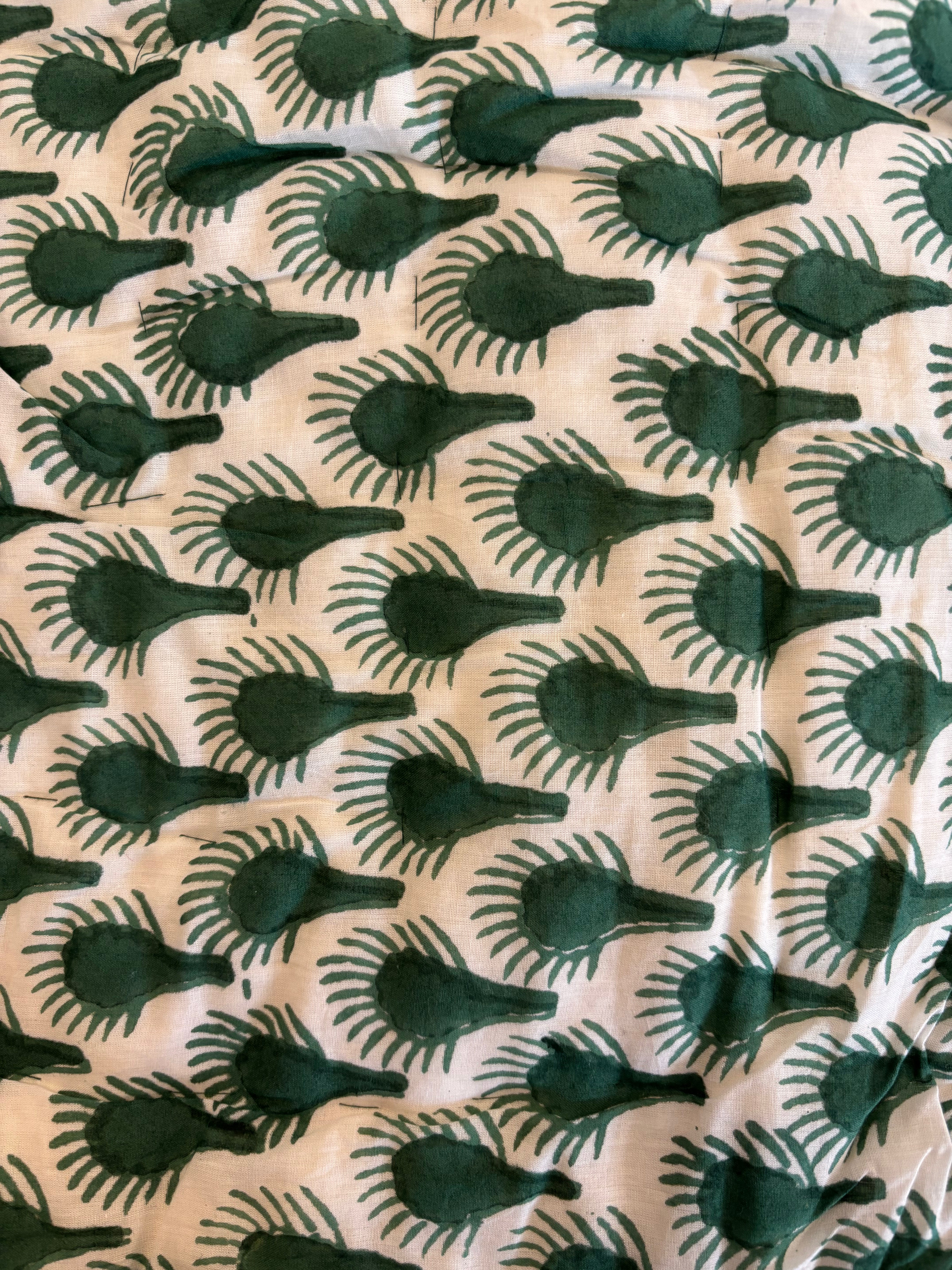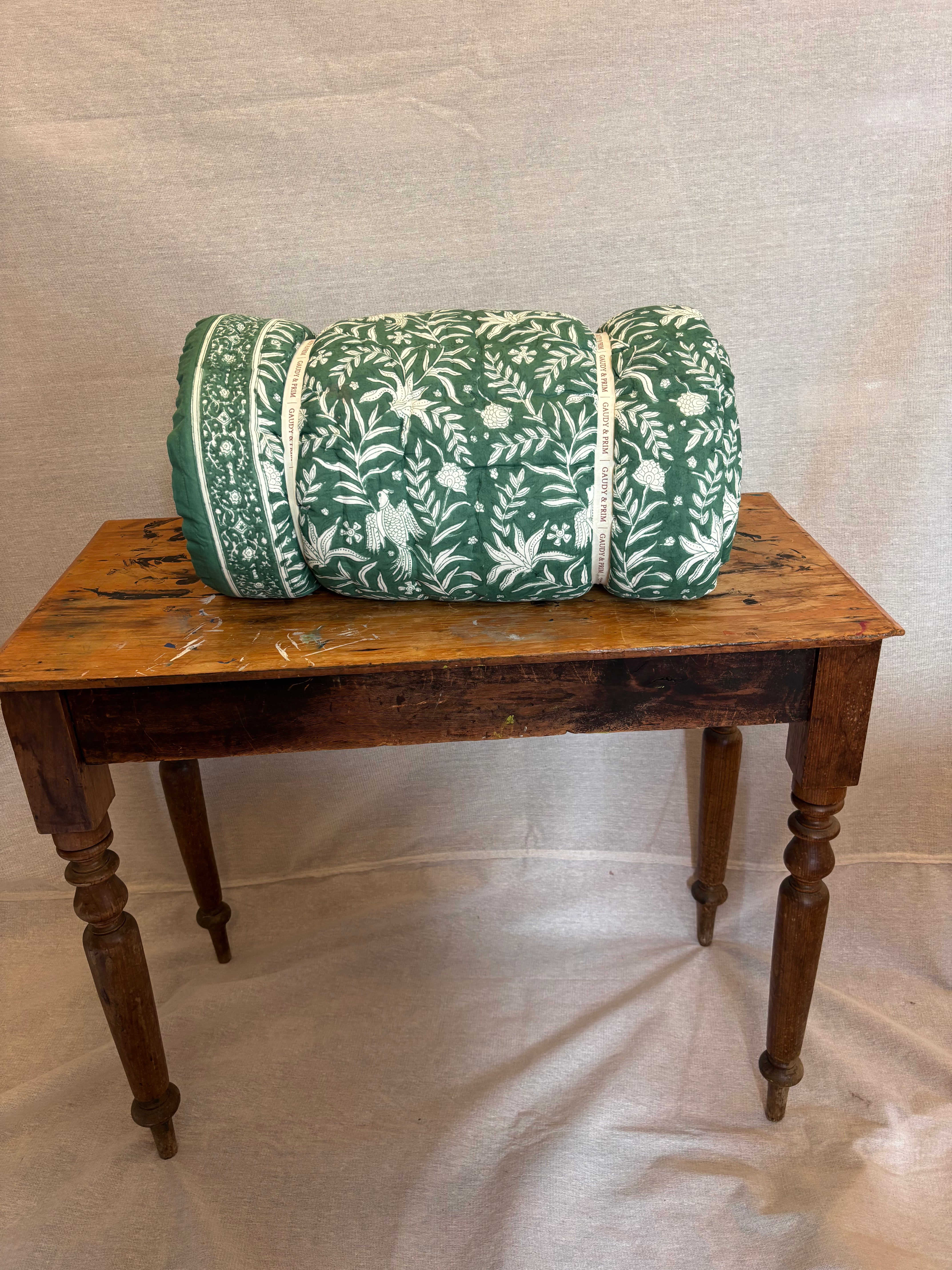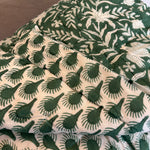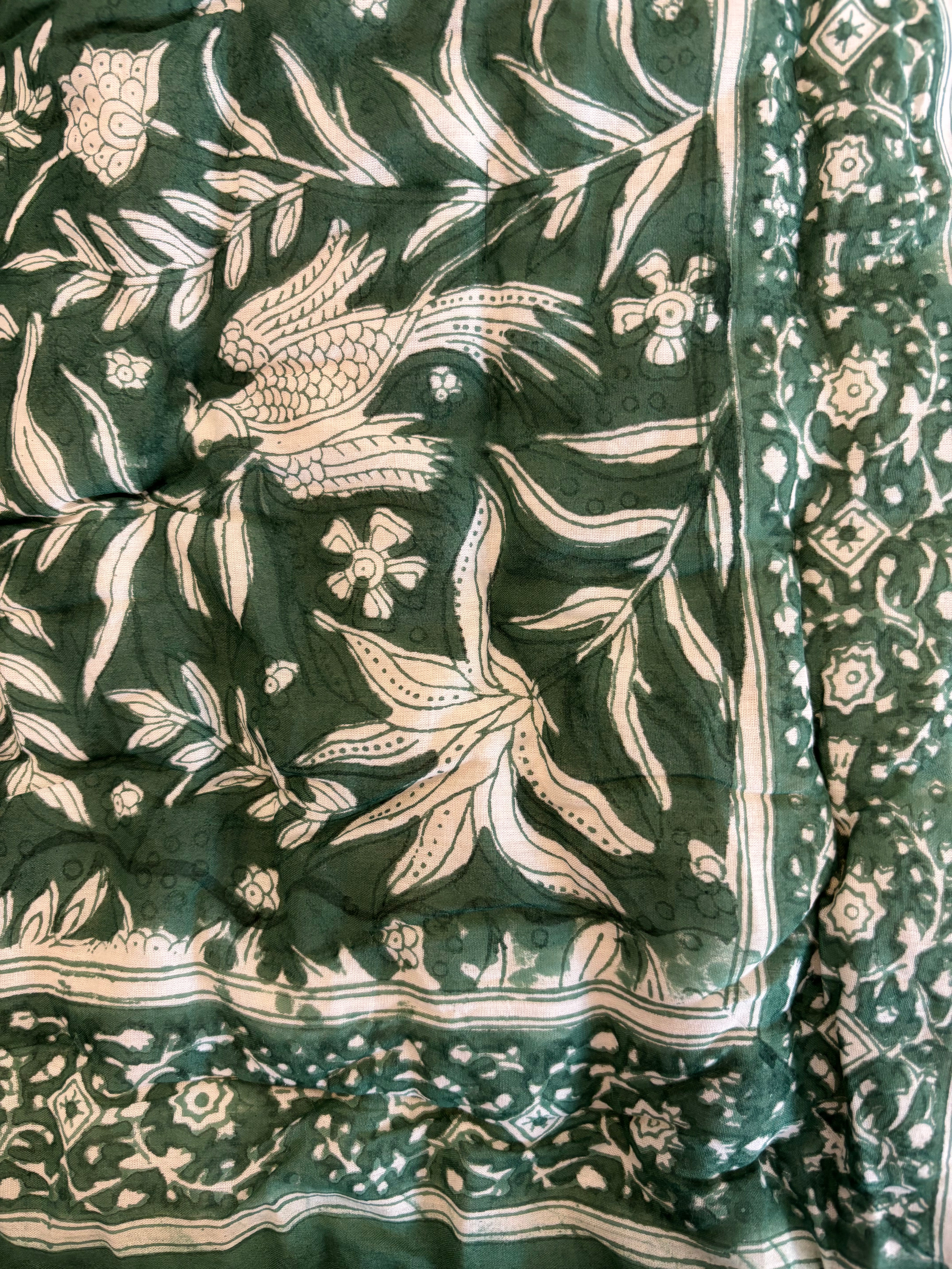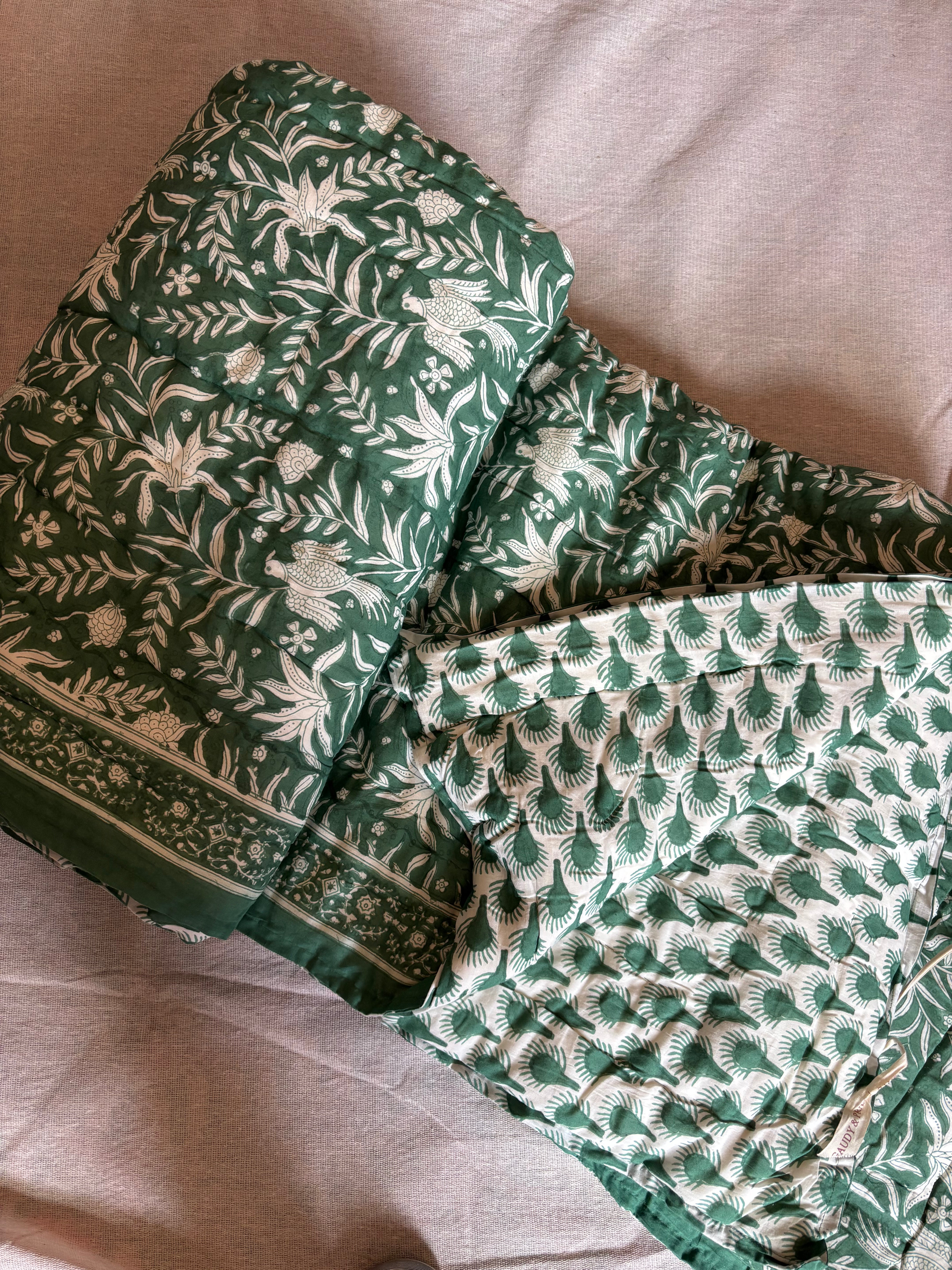 These quilts are lovingly hand block printed by skilled artisans in Jaipur, India using traditional techniques.  They are then filled with natural cotton padding and hand quilted by a skilled group of beautiful ladies in a labour of love that shines through in these beautiful heirloom quilts.  Due to their handcrafted nature, irregularities may occur rendering each piece unique.