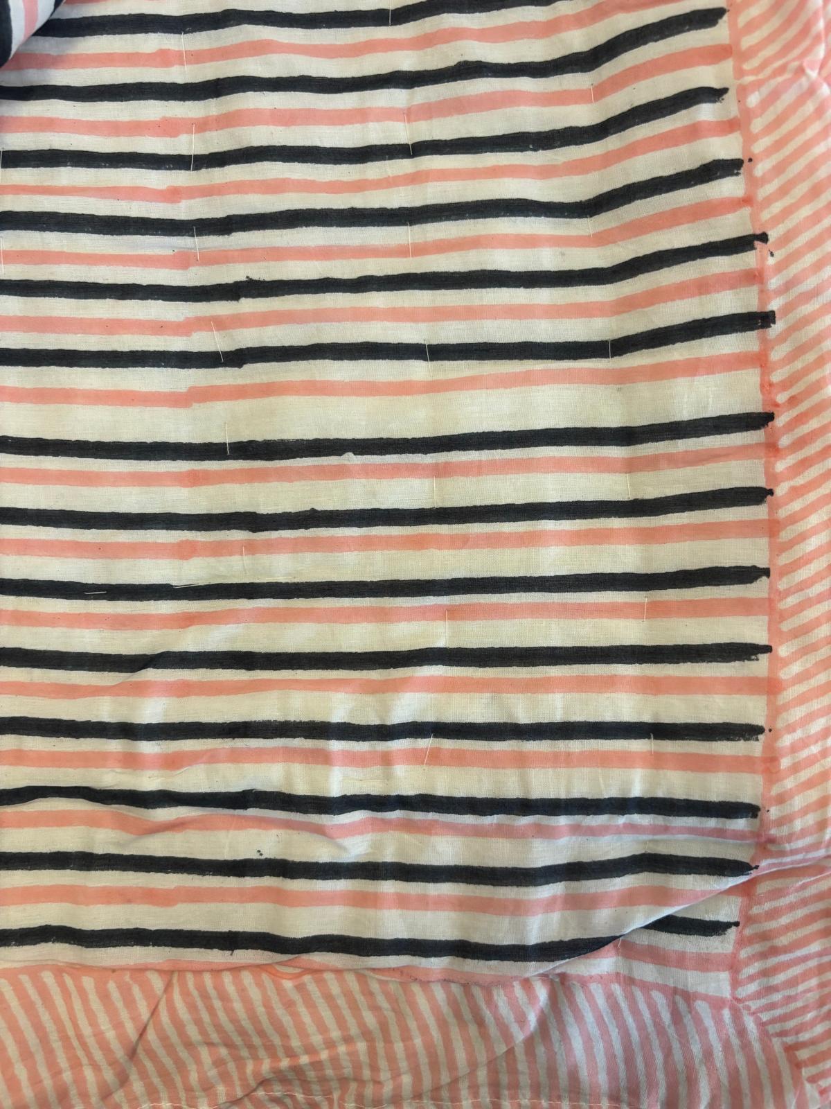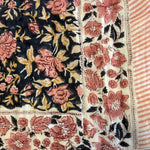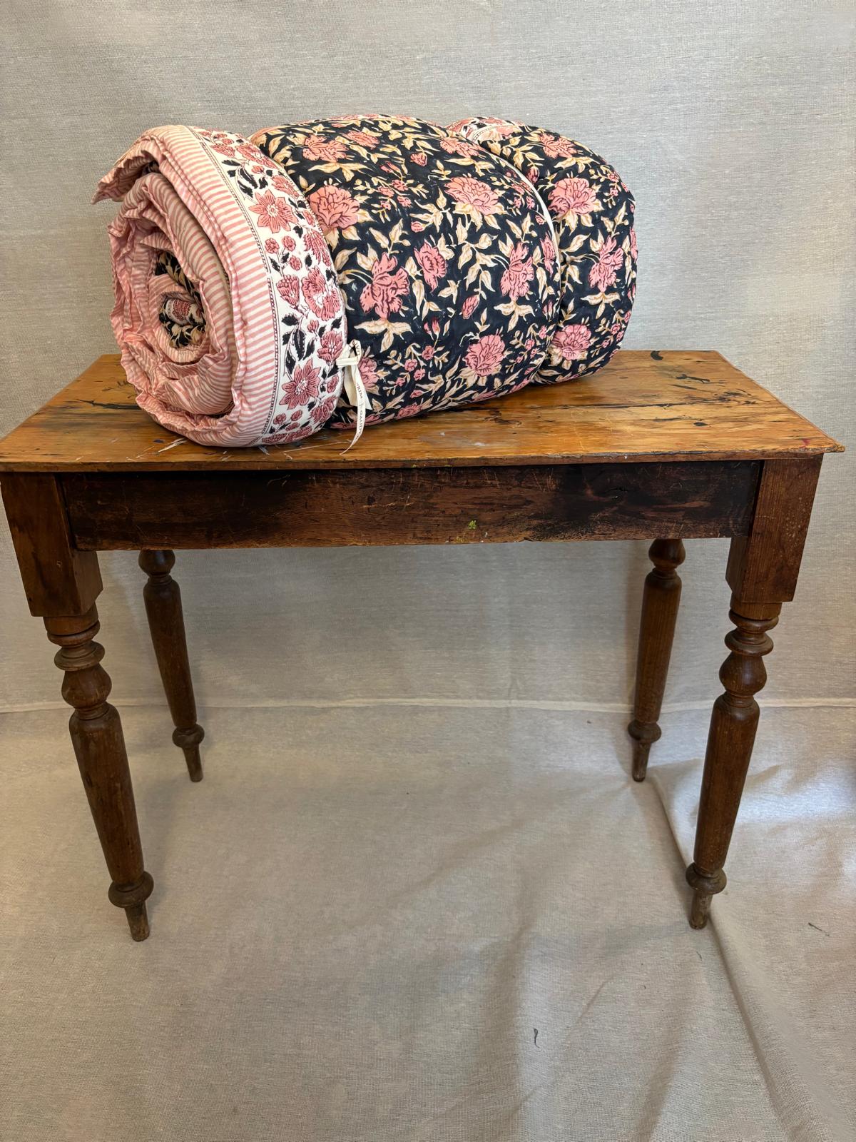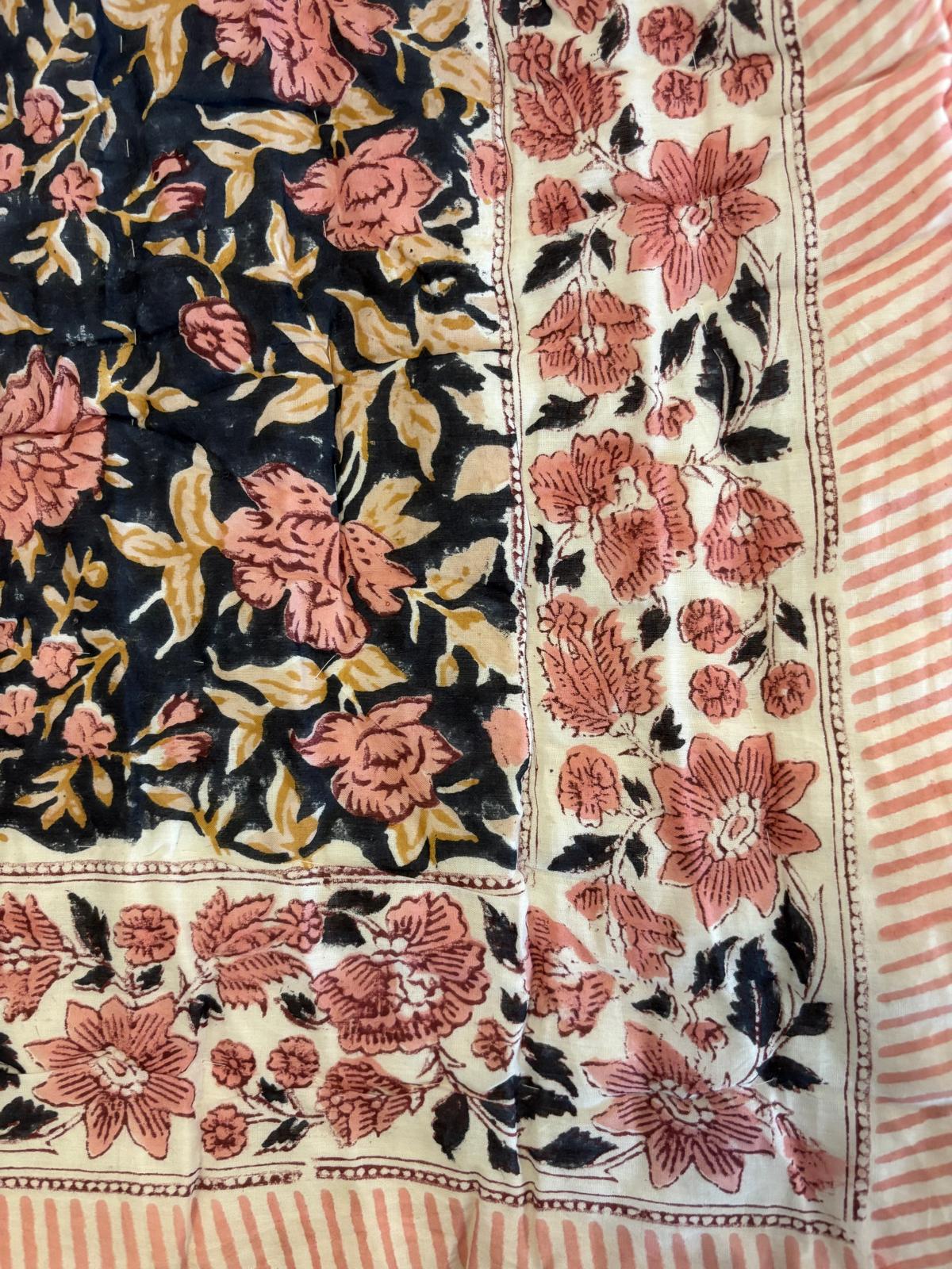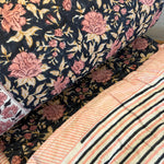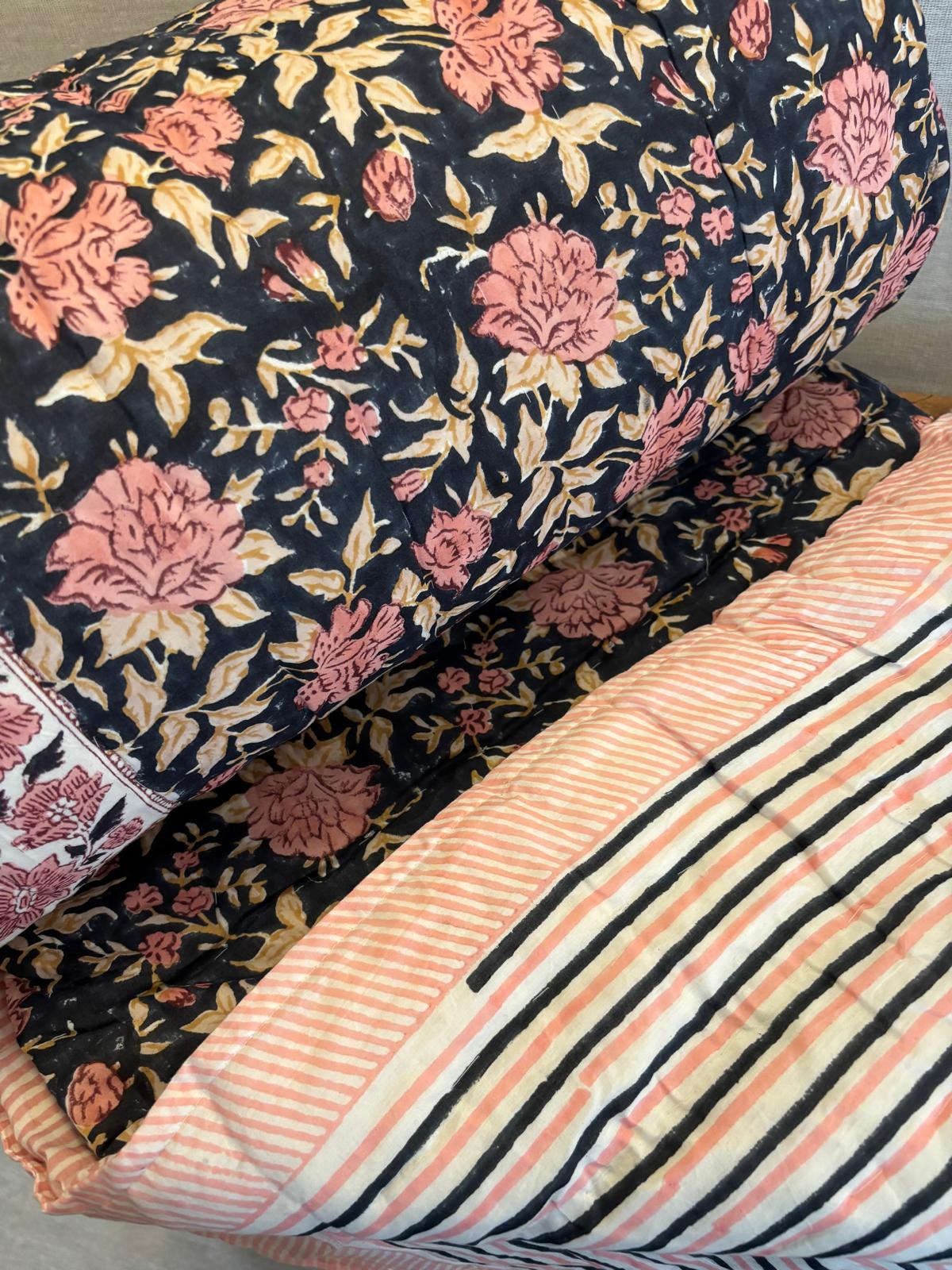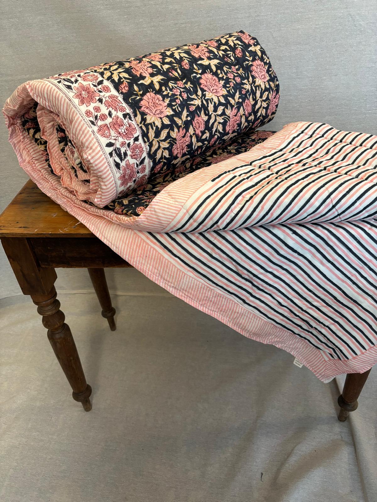 These quilts are lovingly hand block printed by skilled artisans in Jaipur, India using traditional techniques.  They are then filled with natural cotton padding and hand quilted by a skilled group of beautiful ladies in a labour of love that shines through in these beautiful heirloom quilts.  Due to their handcrafted nature, irregularities may occur rendering each piece unique.