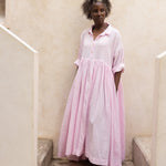 The Edith Dress is made from a medium-weight linen that strikes the perfect balance between structure and softness. The fabric has a gentle drape that gives the skirt movement without feeling heavy. It hangs away from the body, allowing air to circulate — keeping you cool on warm days while still offering a sense of coverage and ease.