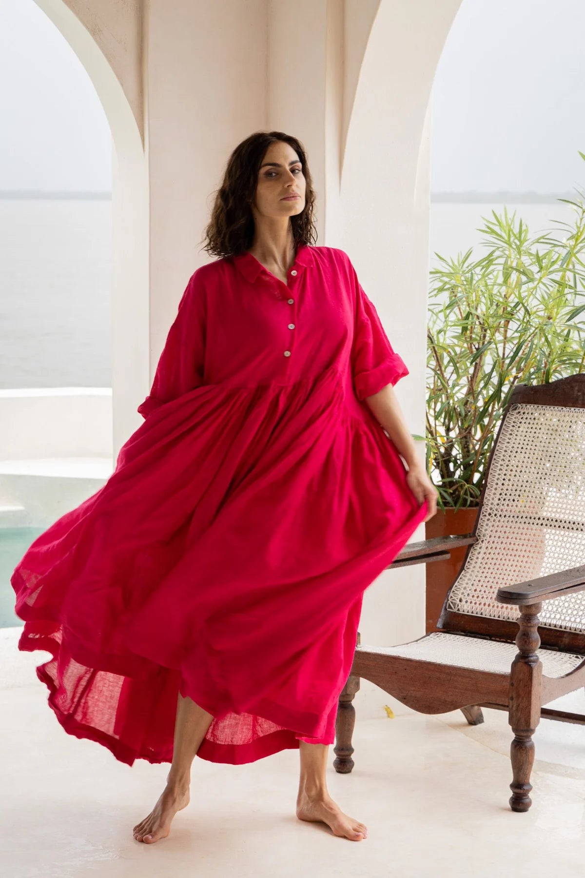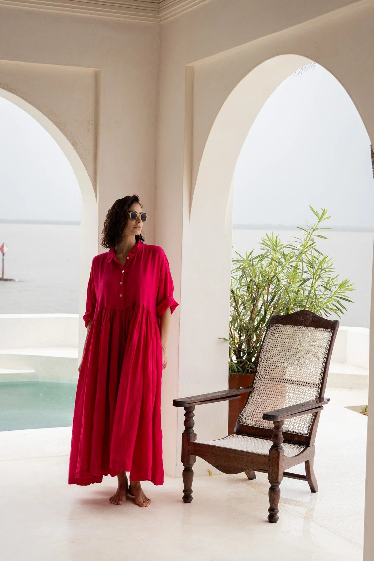 The Edith Dress is made from a medium-weight linen that strikes the perfect balance between structure and softness. The fabric has a gentle drape that gives the skirt movement without feeling heavy. It hangs away from the body, allowing air to circulate — keeping you cool on warm days while still offering a sense of coverage and ease.