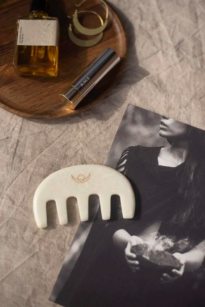 Crafted from genuine Xiu Yan white jade, this luminous Gua Sha scalp stimulating comb is designed to promote hair growth through boosting circulation to the hair follicles.