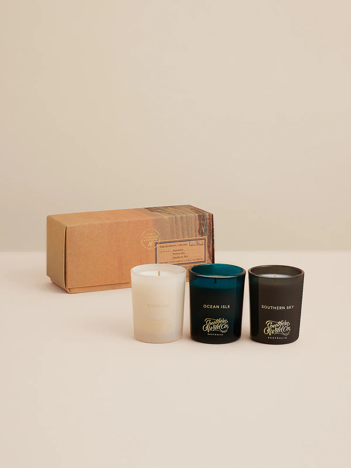 Featuring golden Sunshine, aquatic Ocean Isle, and smoky Southern Sky, this thoughtfully curated set captures the essence of an Australian summer — from coastal breezes to star-strewn skies. Each candle is hand poured into amber glass and presented in a vintage-style gift box, perfect for travel or gifting.