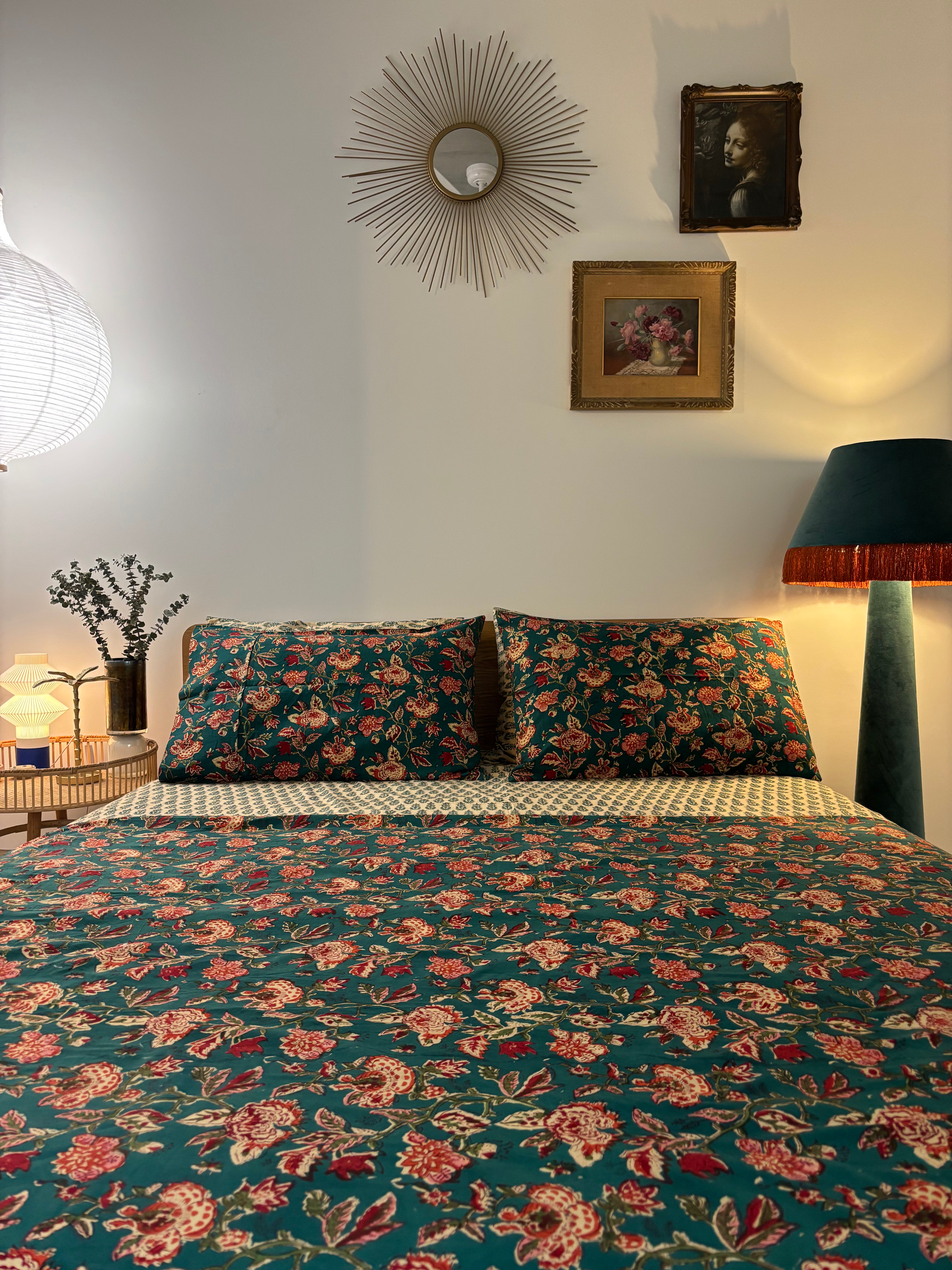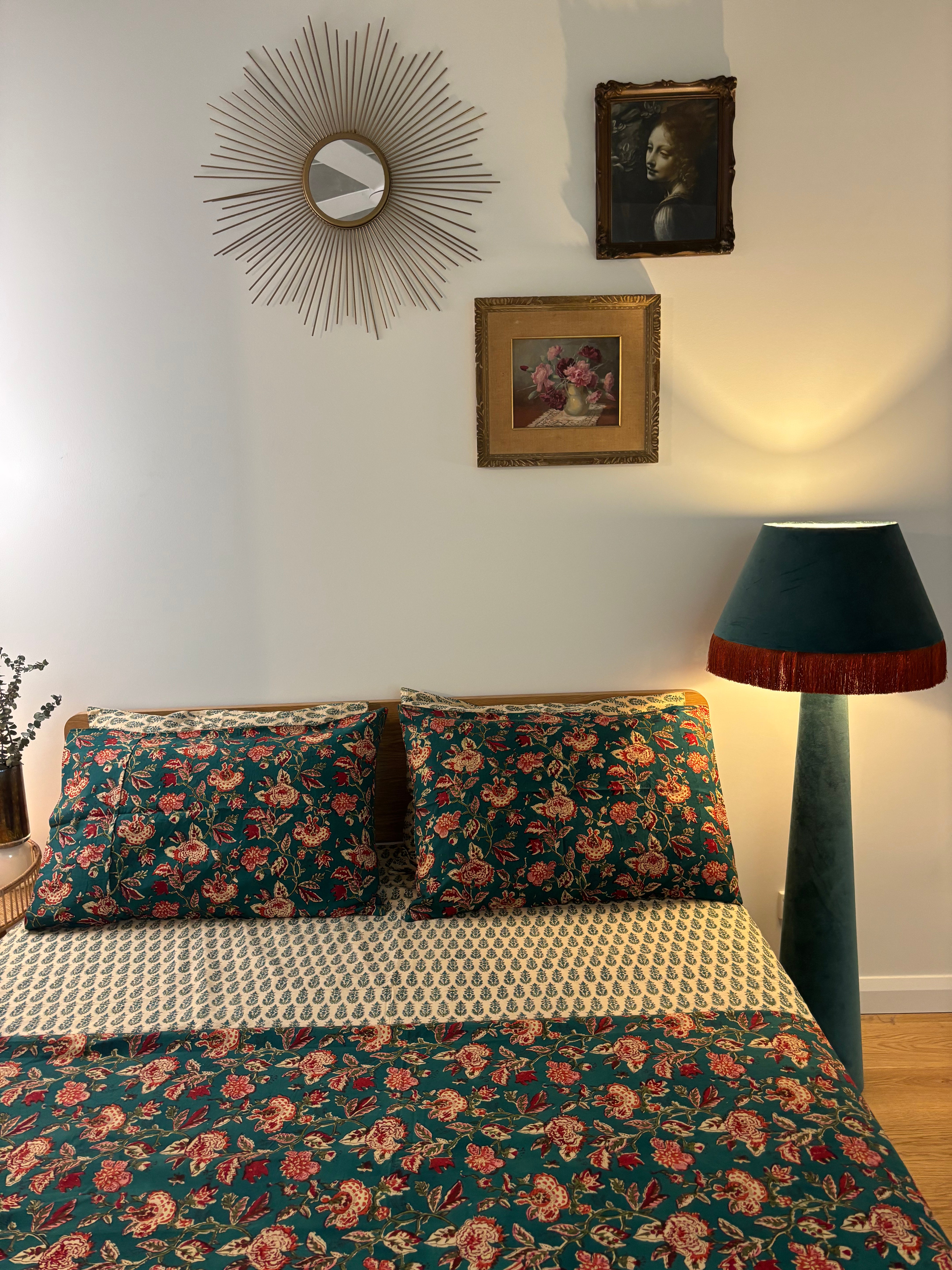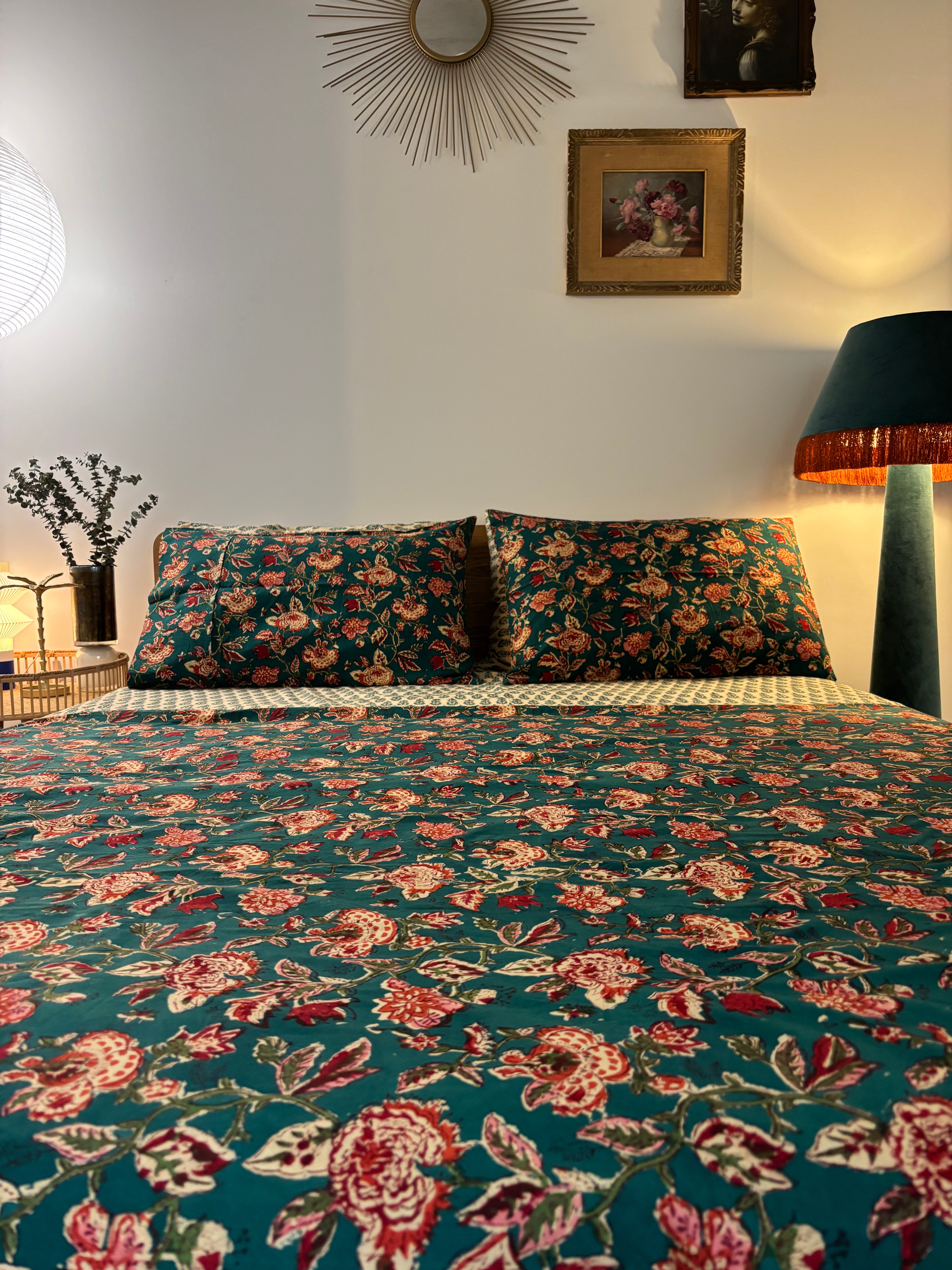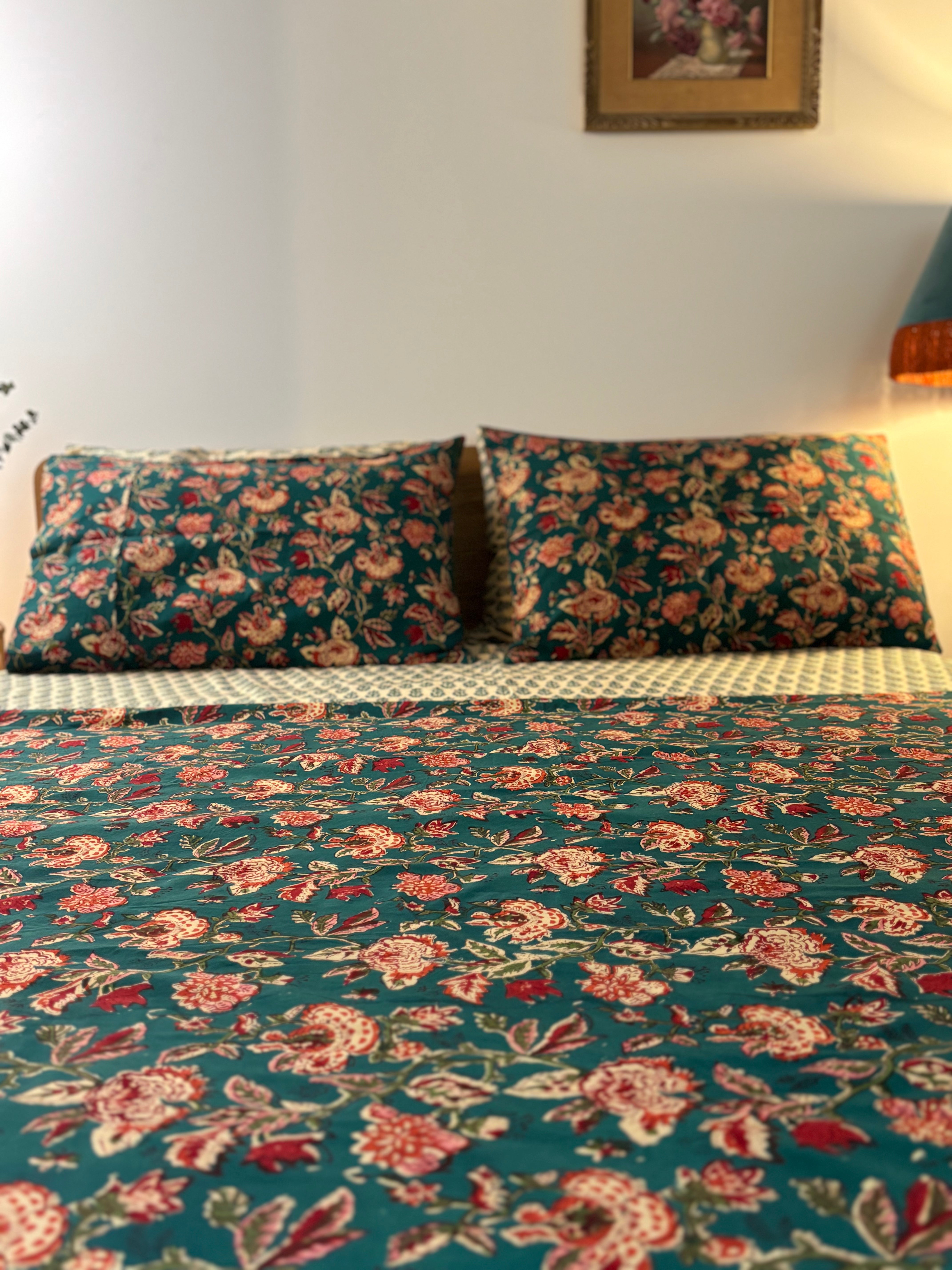 Hand Block Printed Bedding- Blue and red floral