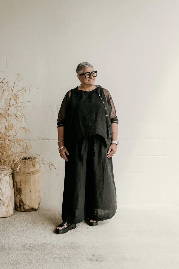 The Harriet trousers are crafted from a beautiful medium weight linen. They feature a wide-leg design and two spacious pockets. The waistband includes a linen belt and is elasticised at the back. The cut offers the flexibility to be worn either low or high waisted. The feel of the linen is incredible and along with the cut and material allow for breathability in the warmer months and the ability to pop on a pair of thermal tights underneath for warmth in the colder months.