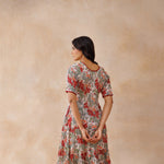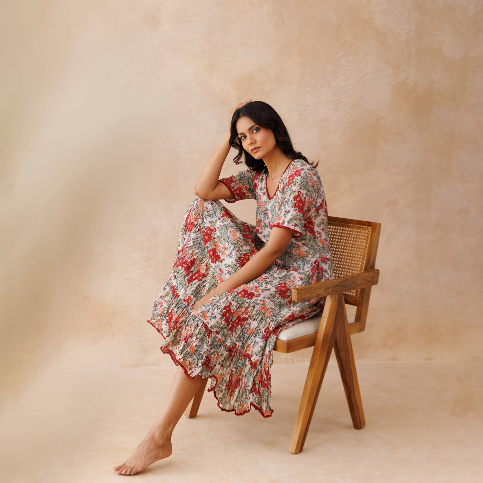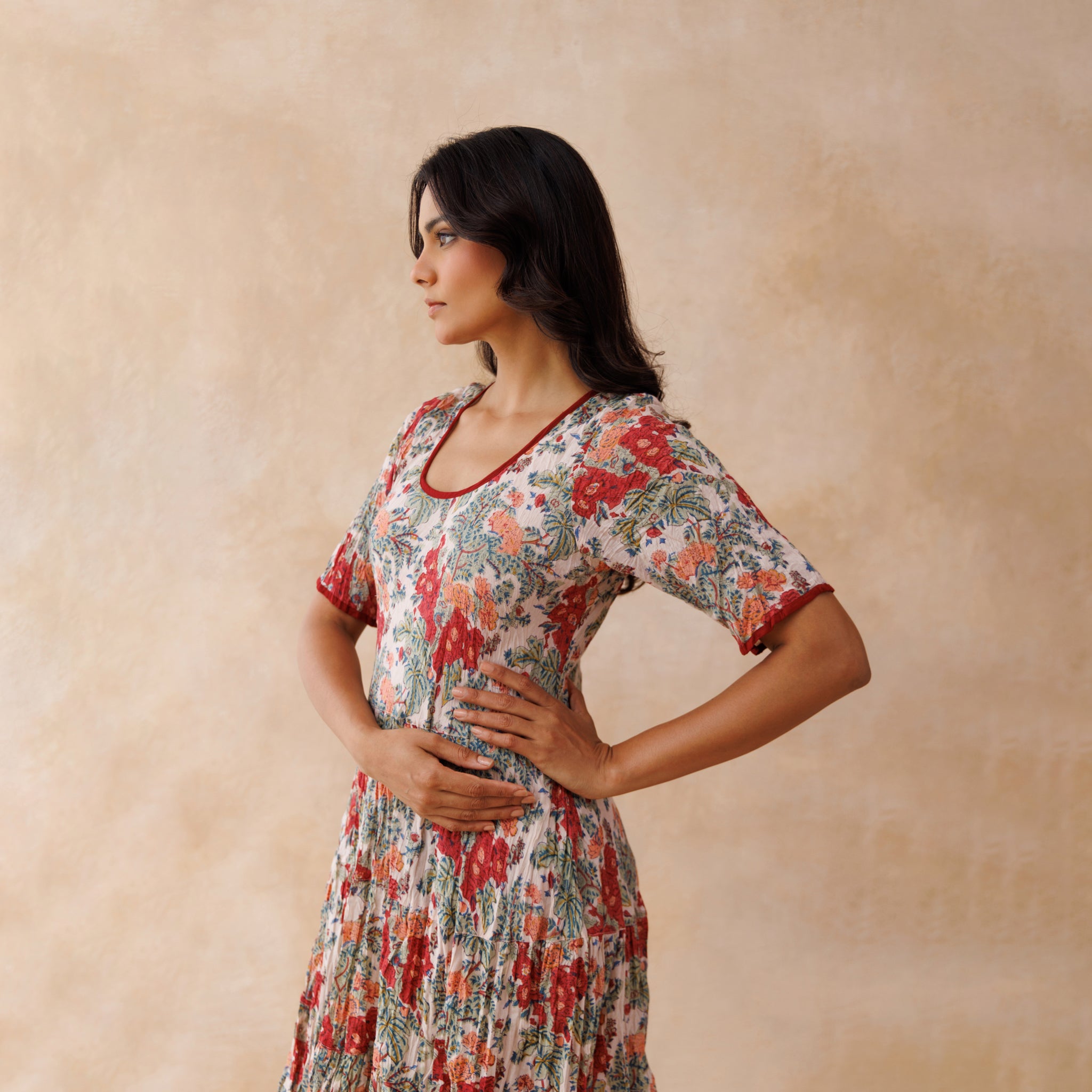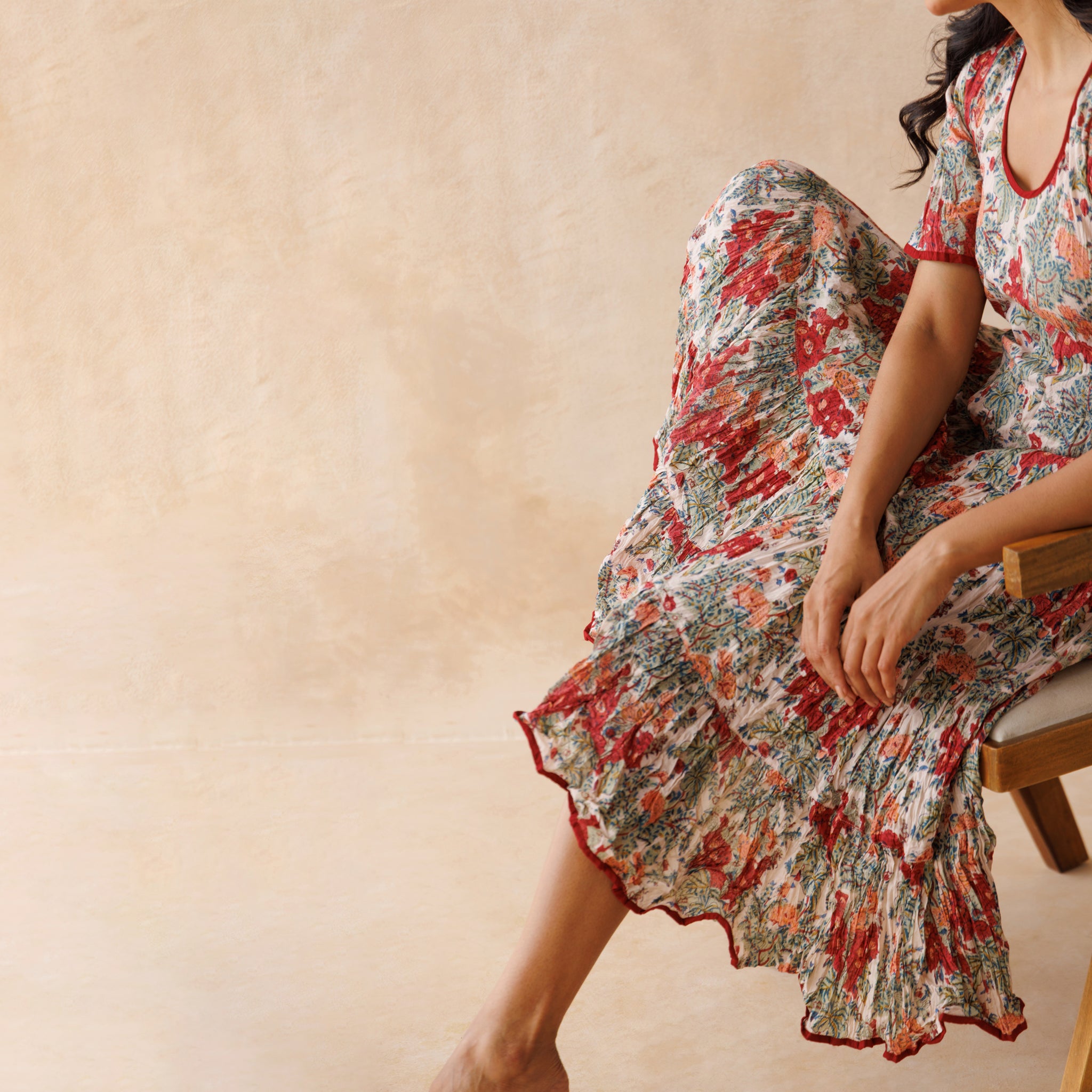 The Ida dress is cut on the bias from soft, hand–block–printed cotton, giving it a naturally flattering drape and comfortable fit. The bodice is shaped to define the waist, and contrast piping highlights the neckline, cuffs, and hem for a clean, finished look.