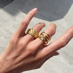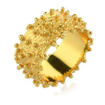 The Ilina ring is an incredible new chunky gold ring. A striking handmade ring formed of tiny gold balls jotted across the ring in a dusty gold finish. A bold piece to dress up any outfit, both day and evening. All jewellery comes boxed with care cards. Metal is 22 carat gold on brass.Size Guide