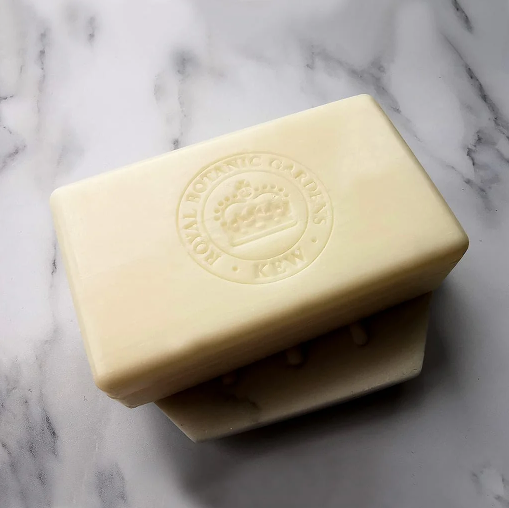 Apricot Vetiver scented luxury soap bar, from the exclusive Royal Botanical Kew Gardens Skincare Collection. This moisturising shea butter soap has  a symphony of fresh and juicy notes, where succulent peach and apricot dance into a heart bursting with exotic mango, Florida orange and raspberry, complemented by a hint of sweet nectarine. A soft musky base with delicate rosewood undertones lingers gently on the skin, leaving you enveloped in a fragrant embrace. The paper wraps are printed with beautiful illustrations selected from Kew Garden’s historic archives to give the product its unique design.