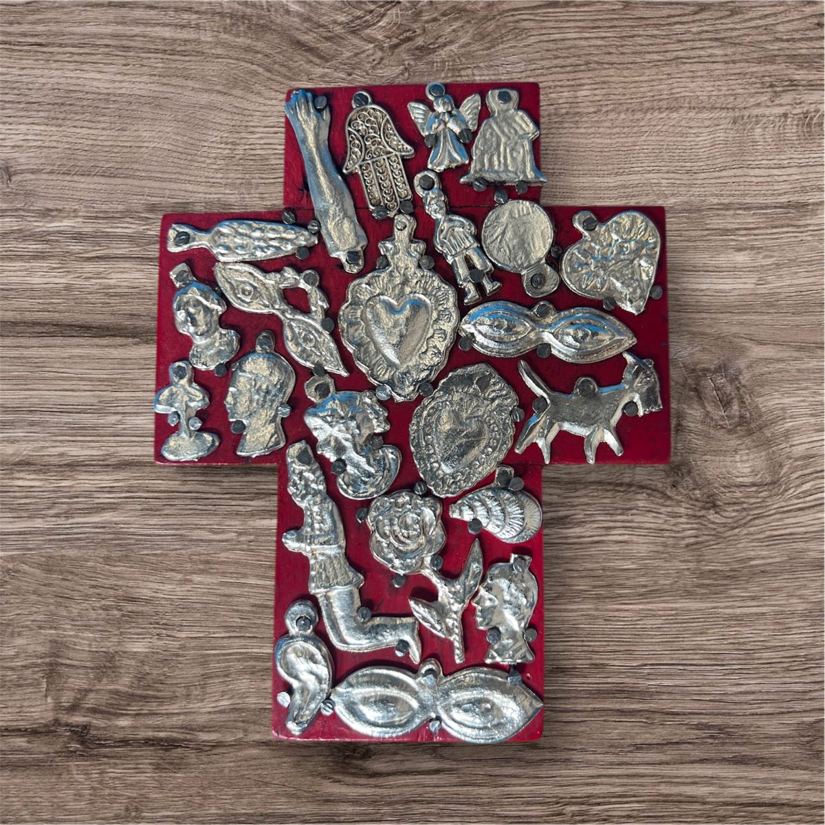 Mexican Red Wooden Cross with Antique Aged Milagros