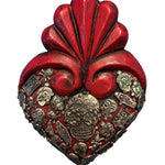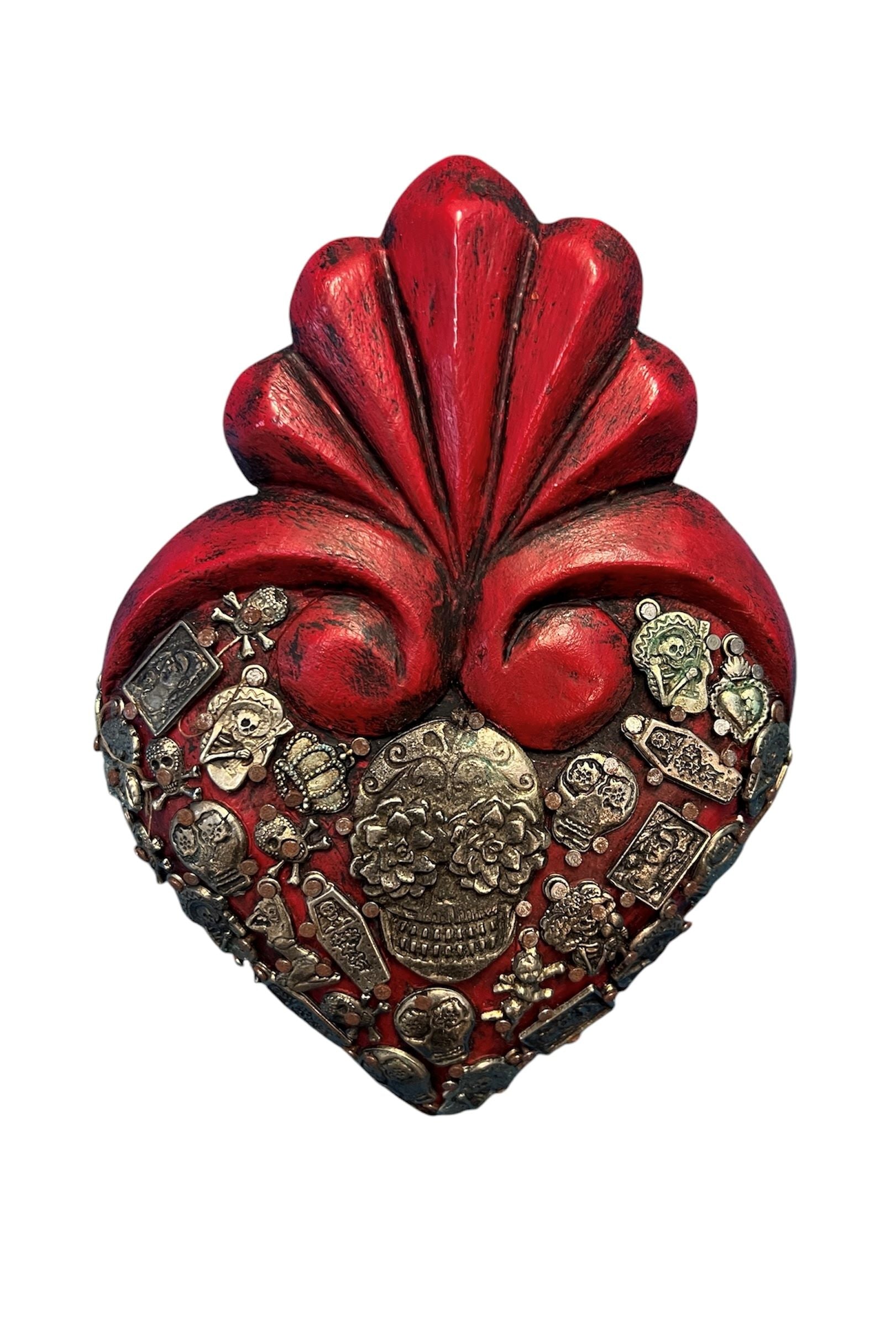 Mexican Wooden Heart with Skull & Antique Aged Gray Coloured Milagros Day of the Dead