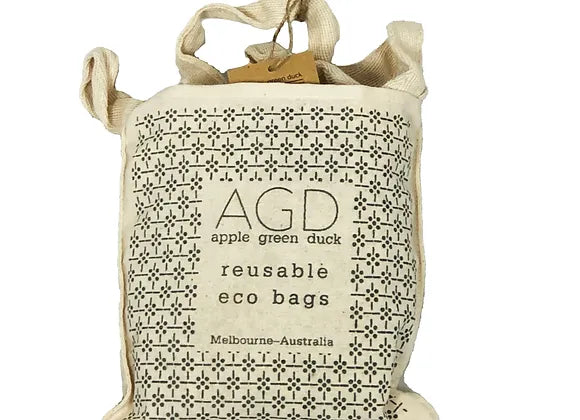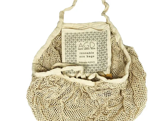 A wide beautifully shaped 100% cotton mesh bag that comes in its own cotton pouch which you can fold back into.  Small items won't fall out, and 2 long comfy handles, it's the most gorgeous net bag!