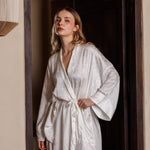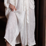 Wrap yourself in effortless luxury with our maxi length kimono robe, exquisitely crafted in silk satin and elevated with a subtle jacquard pattern that catches the light with every movement. This flowing silhouette drapes beautifully over the body, offering both comfort and glamour.