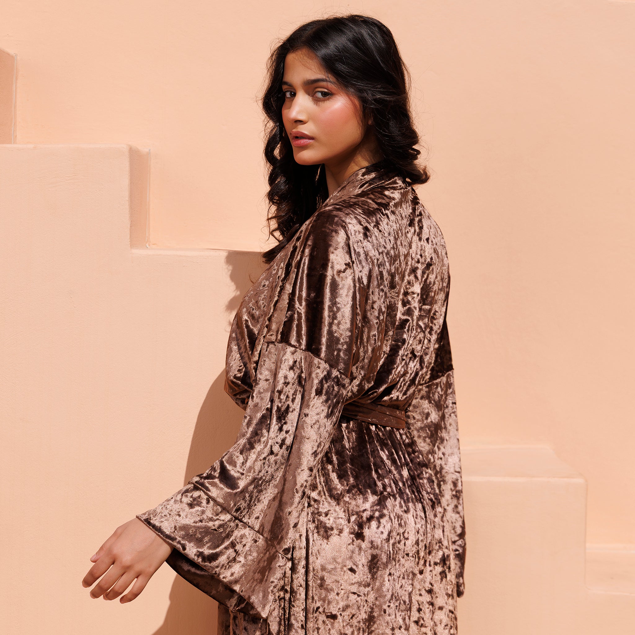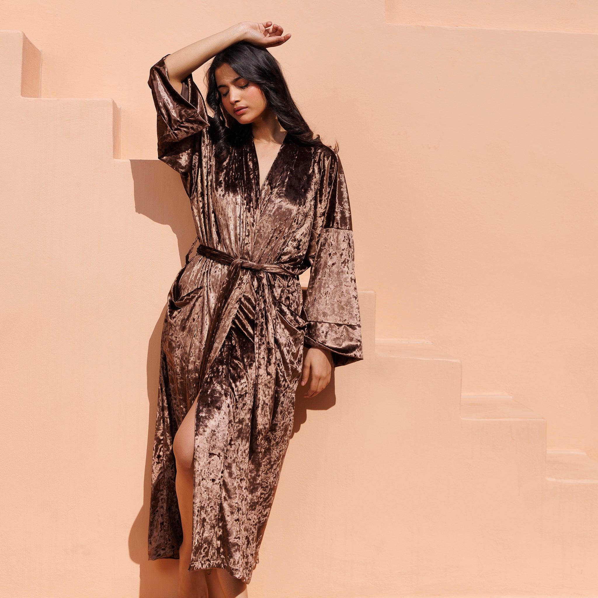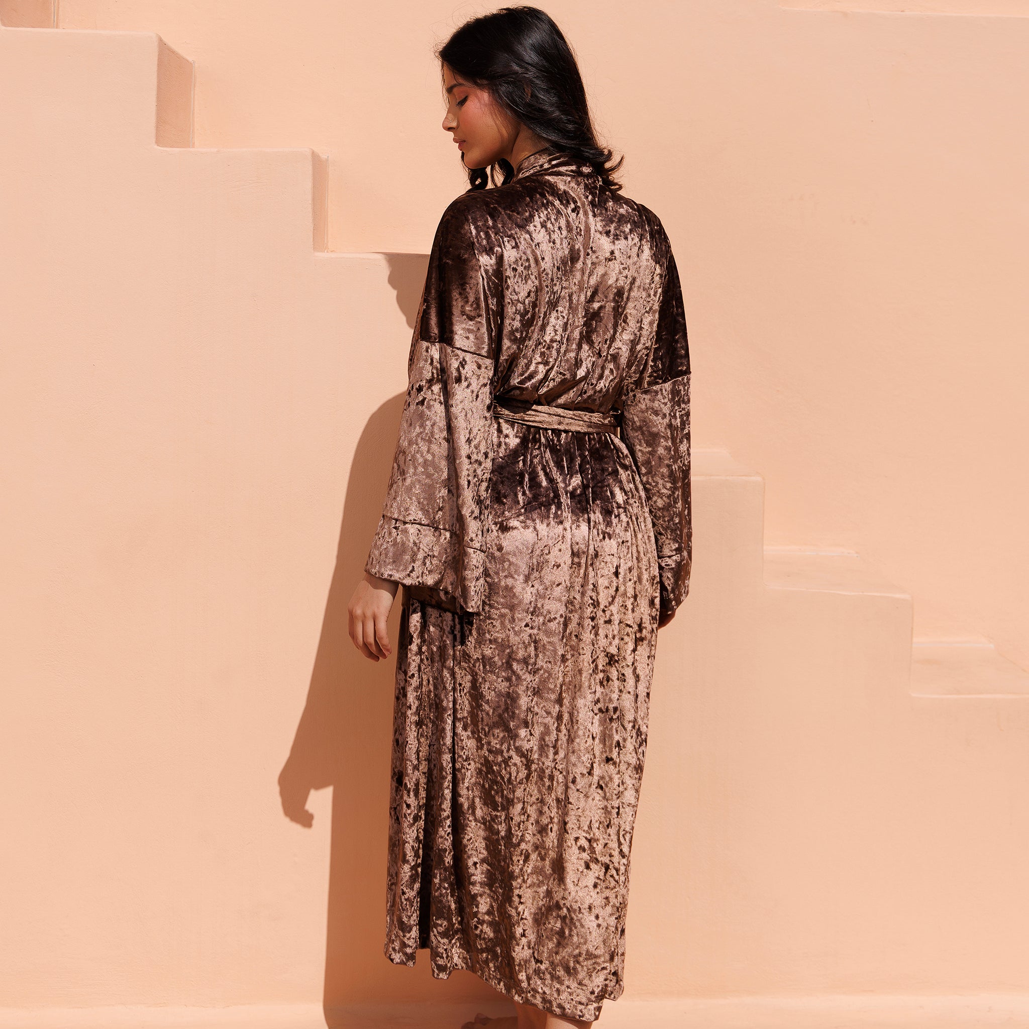 Crafted from crushed velvet with a rich, tactile finish, this piece wraps the body in softness and quiet luxury. It’s made for the in-between moments — after the bath, before the day begins, or whenever you choose to be entirely in your own skin.