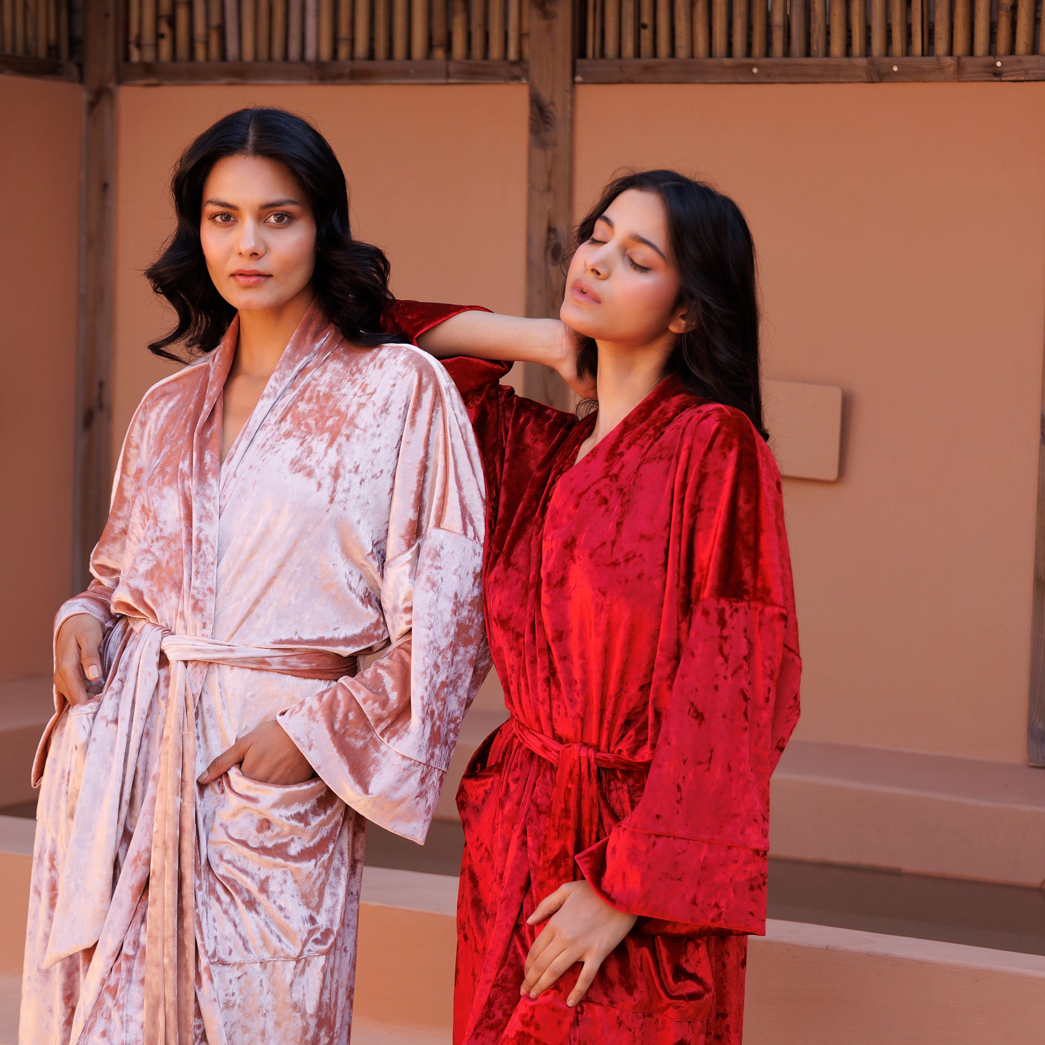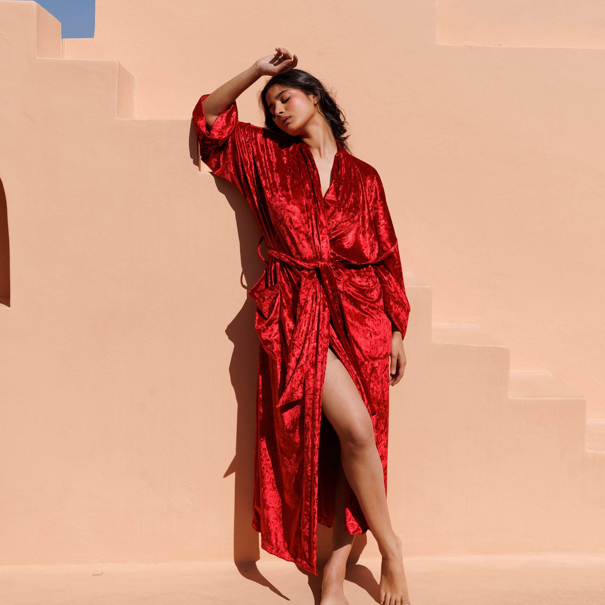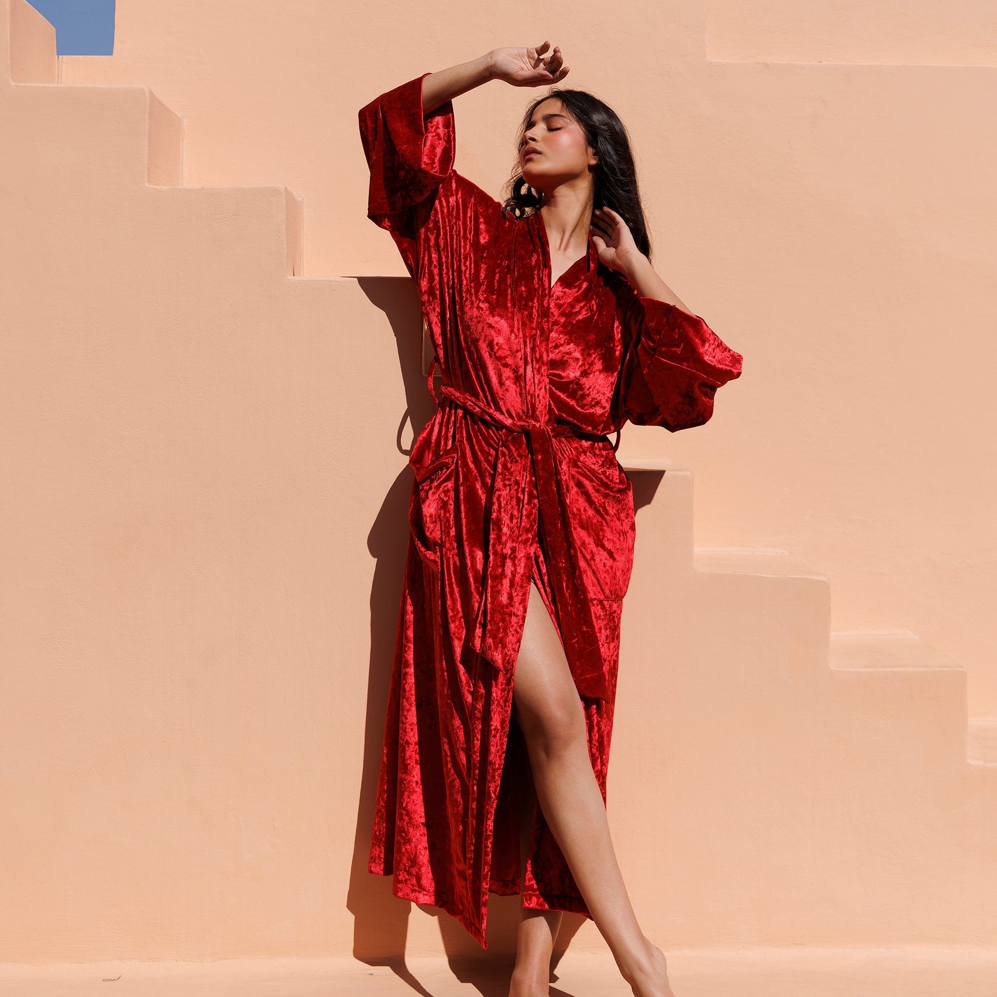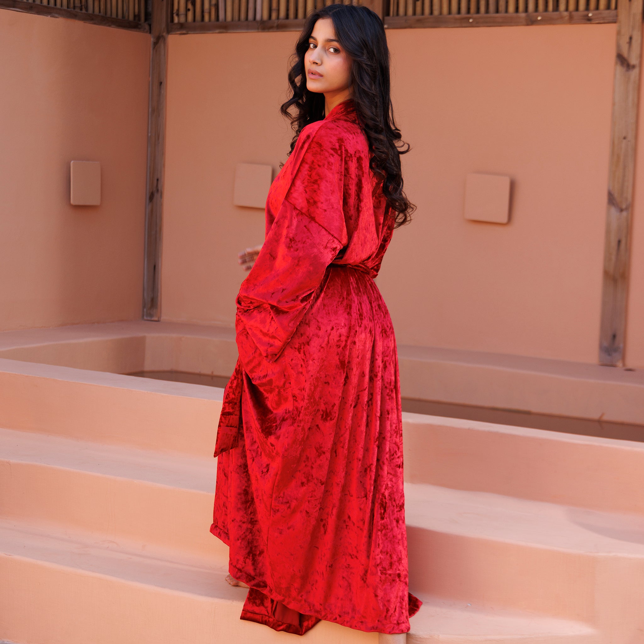 Crafted from crushed velvet with a rich, tactile finish, this piece wraps the body in softness and quiet luxury. It’s made for the in-between moments — after the bath, before the day begins, or whenever you choose to be entirely in your own skin.